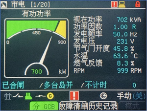 (3) The unit can realize remote start and stop, automatic adjustment of active power and reactive power, automatic synchronization, to meet the needs of automatic units. Complete protection functions, there are engine overspeed, low oil pressure, high water temperature, high oil temperature engine protection, but also reverse power, overcurrent, undervoltage/overvoltage, underfrequency/overfrequency generator protection functions. Display: Complete display parameters to meet the needs of display, parameter setting, alarm, history and so on